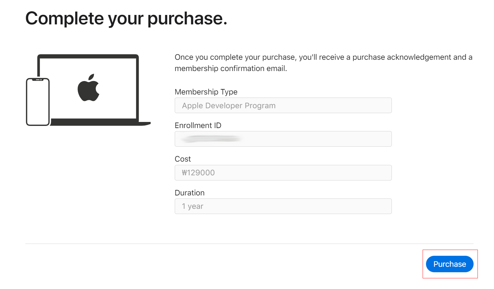 결제 한 후 등록 대기 - 바로 등록되지 않고 약 48시간 내에 등록된다고 하니 여유있게 신청할 것 - 진행중인 경우 우상단 이름쪽에 Pending으로 떠있다. 결제과정이 실패했을 경우 - 개발자 사이트 접속시 결제를 바로 진행할 수 있도록 화면이 뜬다. - complete your purchase now 클릭해서 결제 진행 |