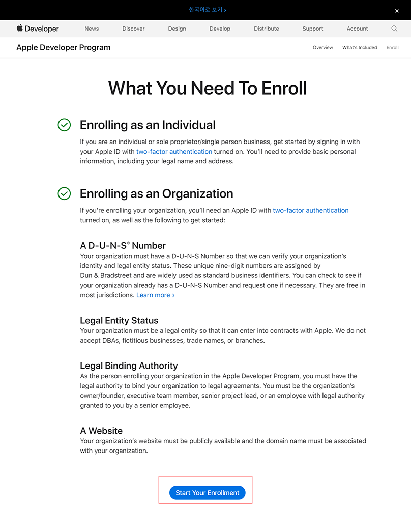 Select your entity type(법인 유형을 선택해 주십시오) - Individual / Sole Proprietor(개인/개인사업자) 선택 - Continue 클릭 기업으로 선택할 경우 D-U-N-S 번호 필요 링크 참조 https://developer.apple.com/kr/support/app-account/ |