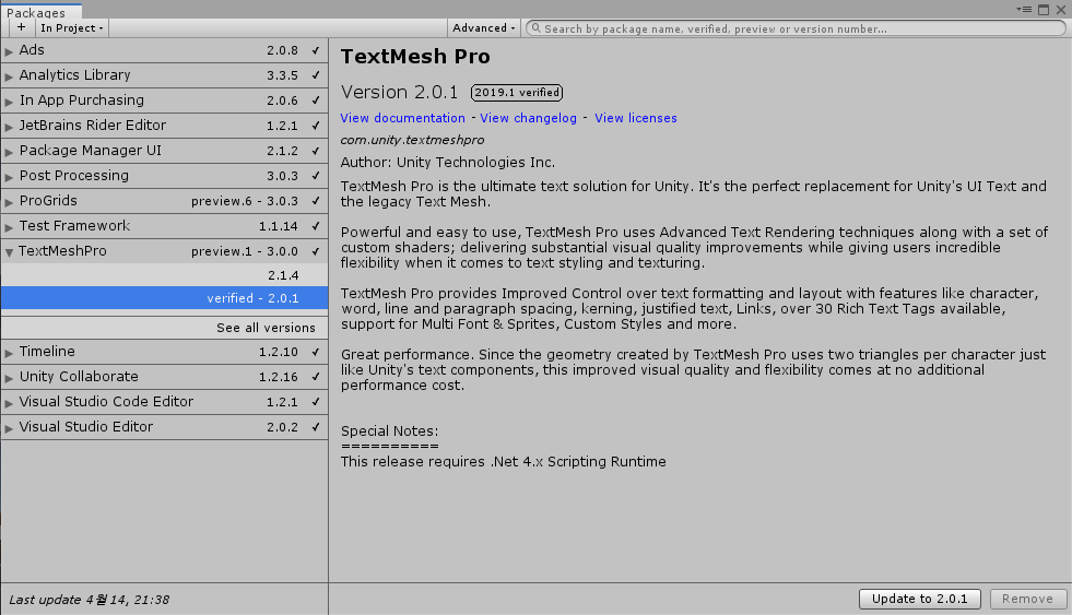 | 3 | Package Manager - 좌측 패키지 리스트에서 위 경로와 같은 이름의 패키지 업데이트/혹은 다운그레이드 하기 |