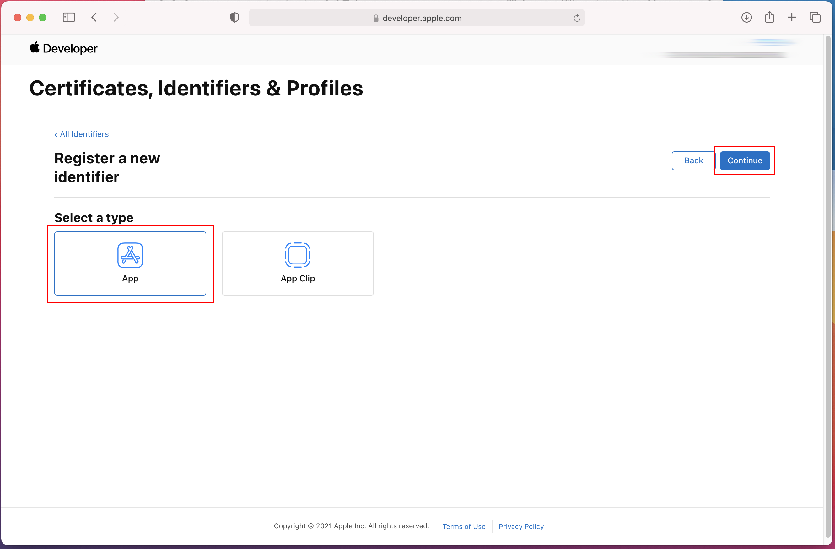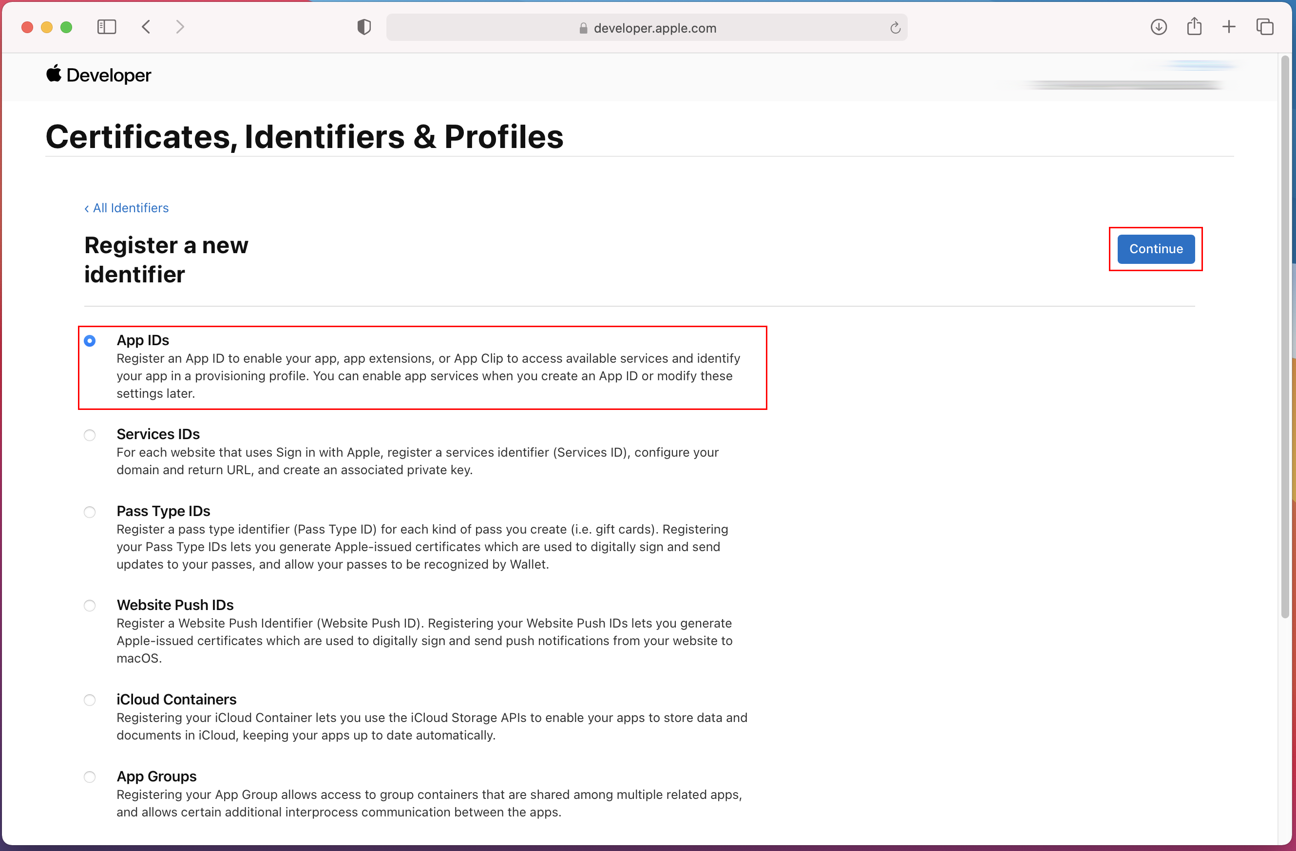 Register a new identifier - App IDs 선택 - Continue |